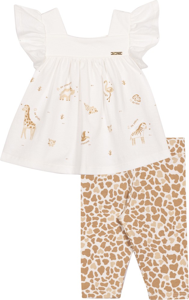Com uma legging estampada em animal print de Girafinha, esse conjunto Nini & Bambini ainda conta com uma blusa linda e delicada, no estilo bata. Opção perfeita para deixar sua pequena ainda mais charmosa!