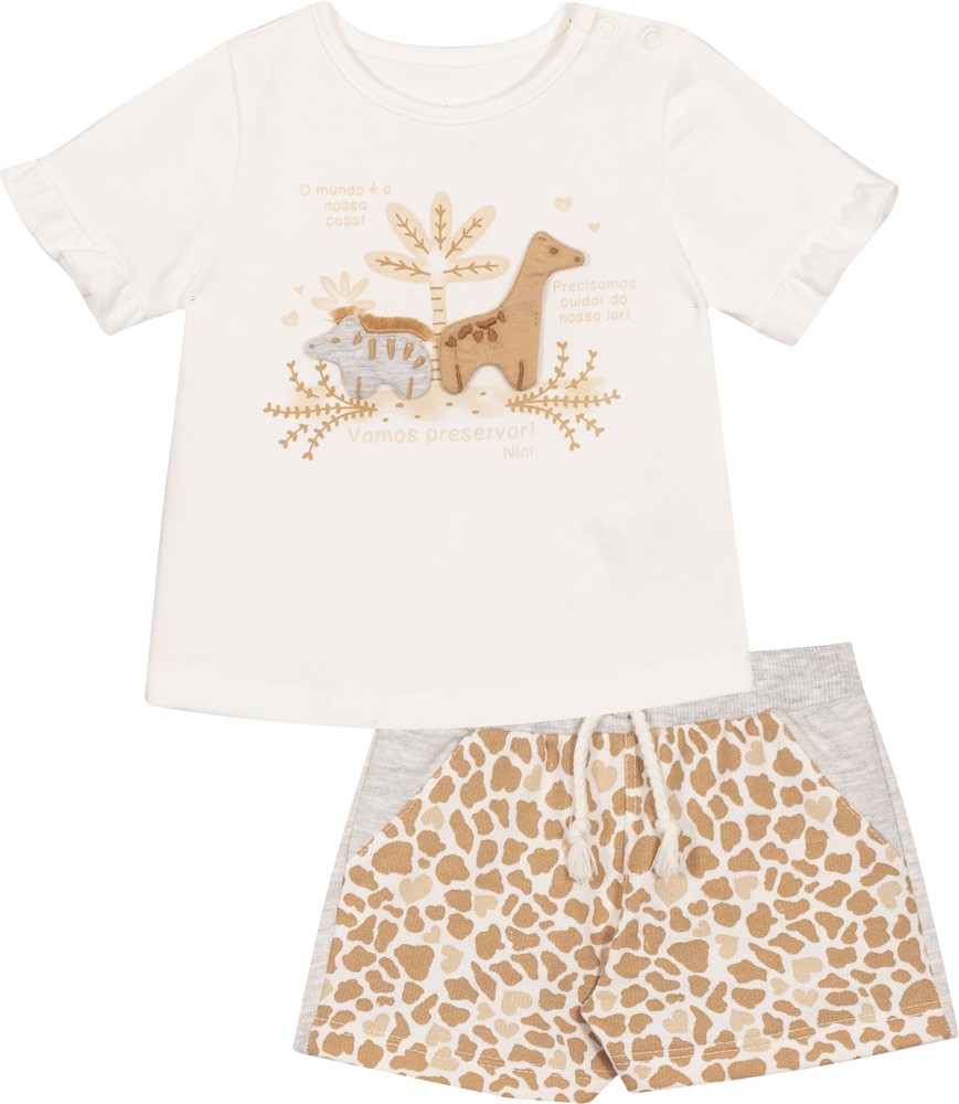 Esse conjunto Nini & Bambini vai deixar a primavera da sua pequena ainda mais alegre! A blusa é super delicada e possui aplique de bichinhos. O shorts é feito em moletinho com estampa animal print de Girafinha.