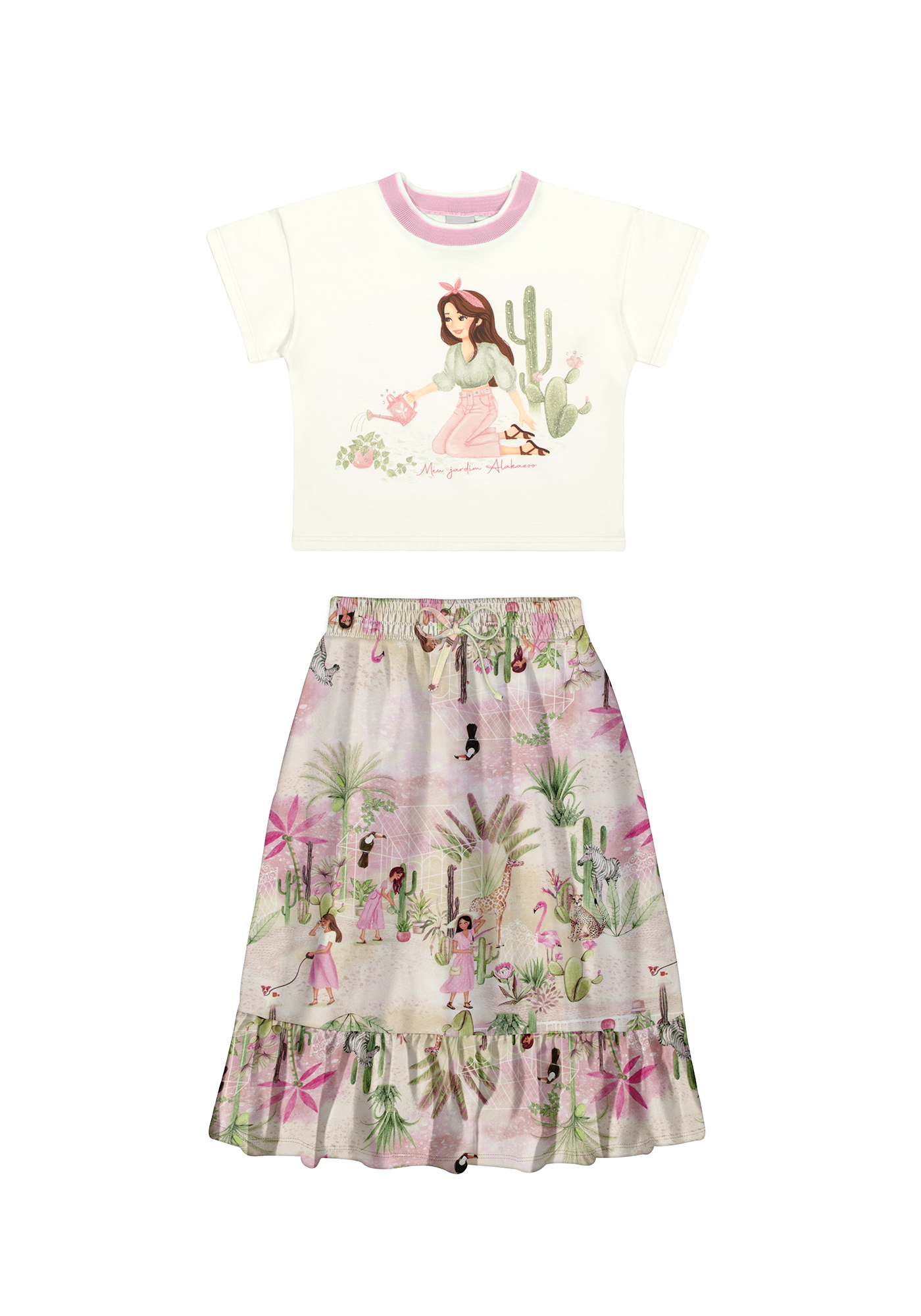Olha só esse conjunto Alakazoo que é puro estilo para as meninas! A blusa tem detalhes em strass e retilínea na gola, dando aquele toque especial. Já saia midi é um verdadeiro jardim encantado, com estampa lúdica incrível. E o melhor de tudo, é super confortável para elas aproveitarem os dias de verão! Combine com uma papete e deixe suas pequenas brilharem com toda a magia da Alakazoo.