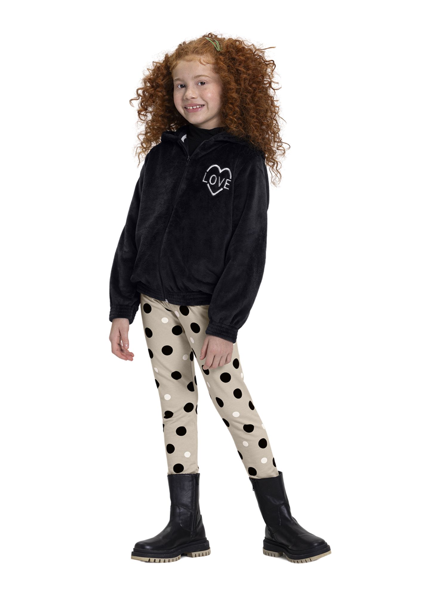 O conjunto mais quentinho e moderninho do inverno! A jaqueta de Pelo é uma fofura, macia e mega estilosa, enquanto a calça legging com estampa de poá é pura diversão! E a melhor parte? As peças podem brilhar separadamente, criando outros looks mágicos. Vai ser o preferido das pequenas fashionistas!