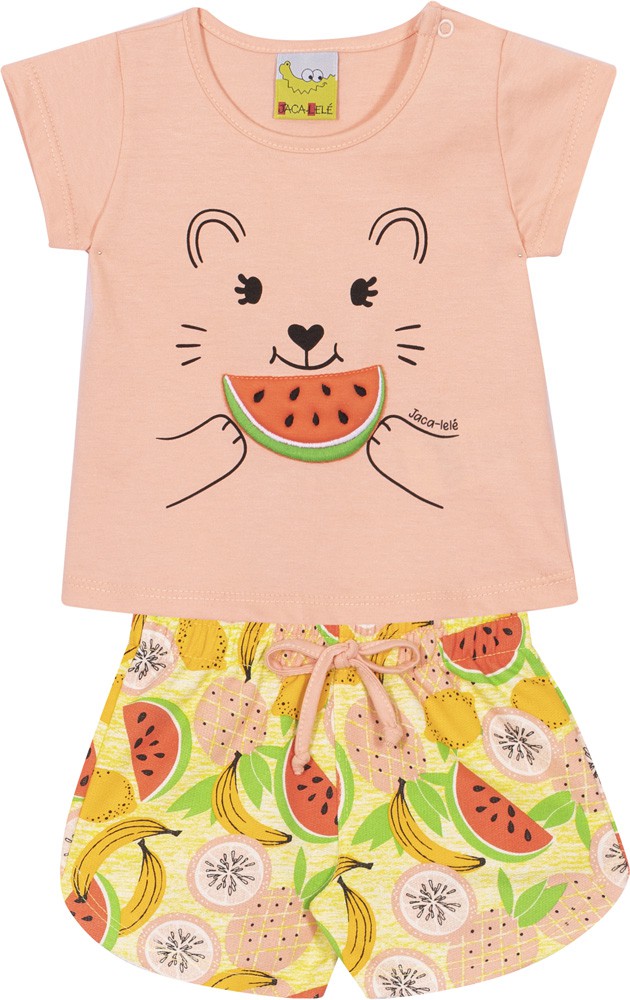 O conjunto que é a cara da estação: confortável, fresquinho e cheio de personalidade. A blusa tem um aplique de melancia em relevo e o shorts em moletinho estampado tem uma modelagem linda. Tênis ou sandália, você escolhe: ele fica lindo com tudo!