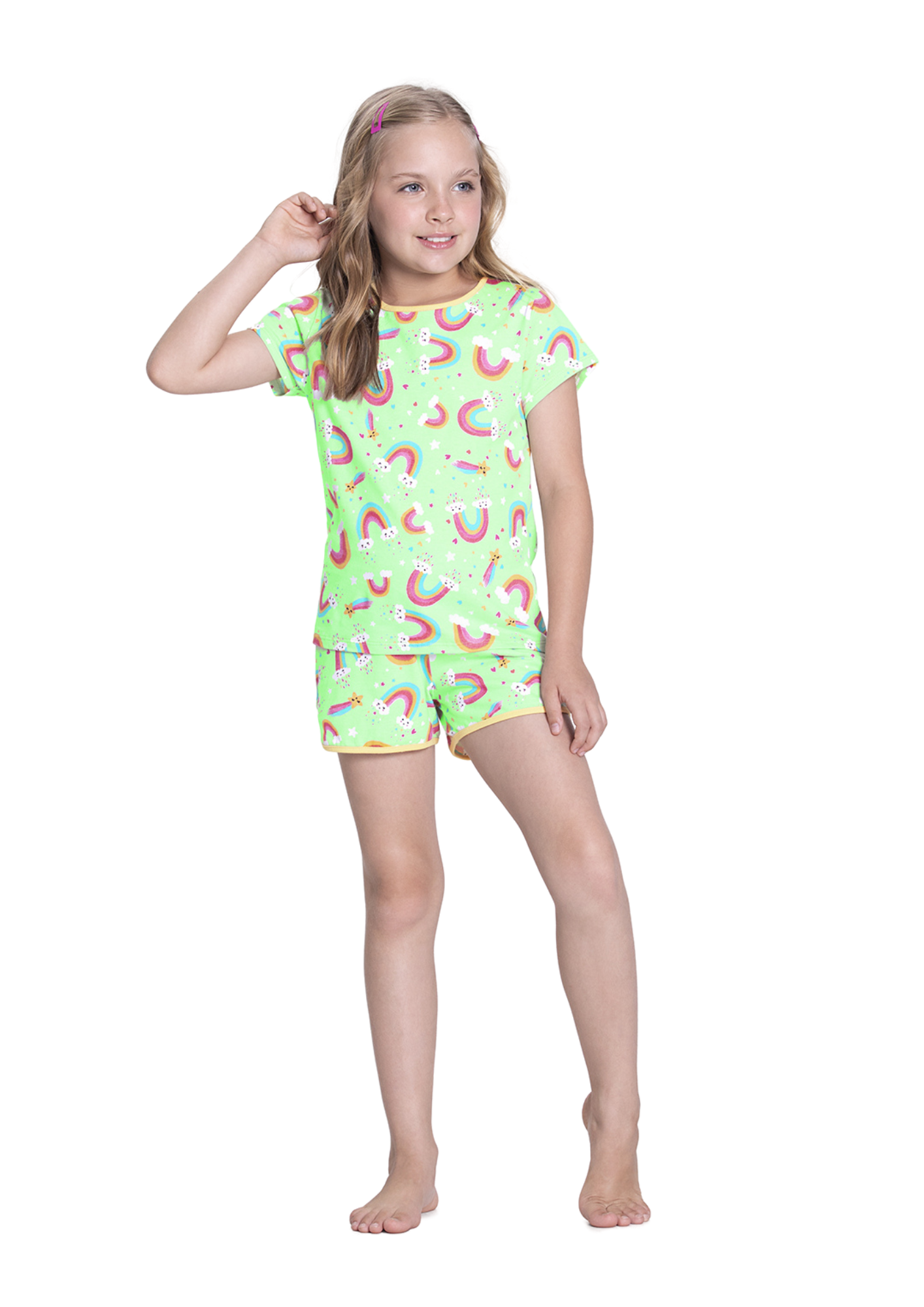 Cor: Verde com estampa colorida de Arco-íris